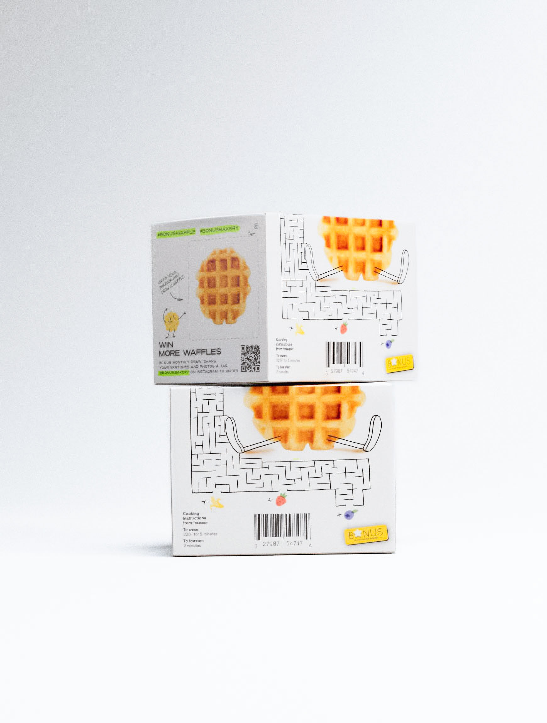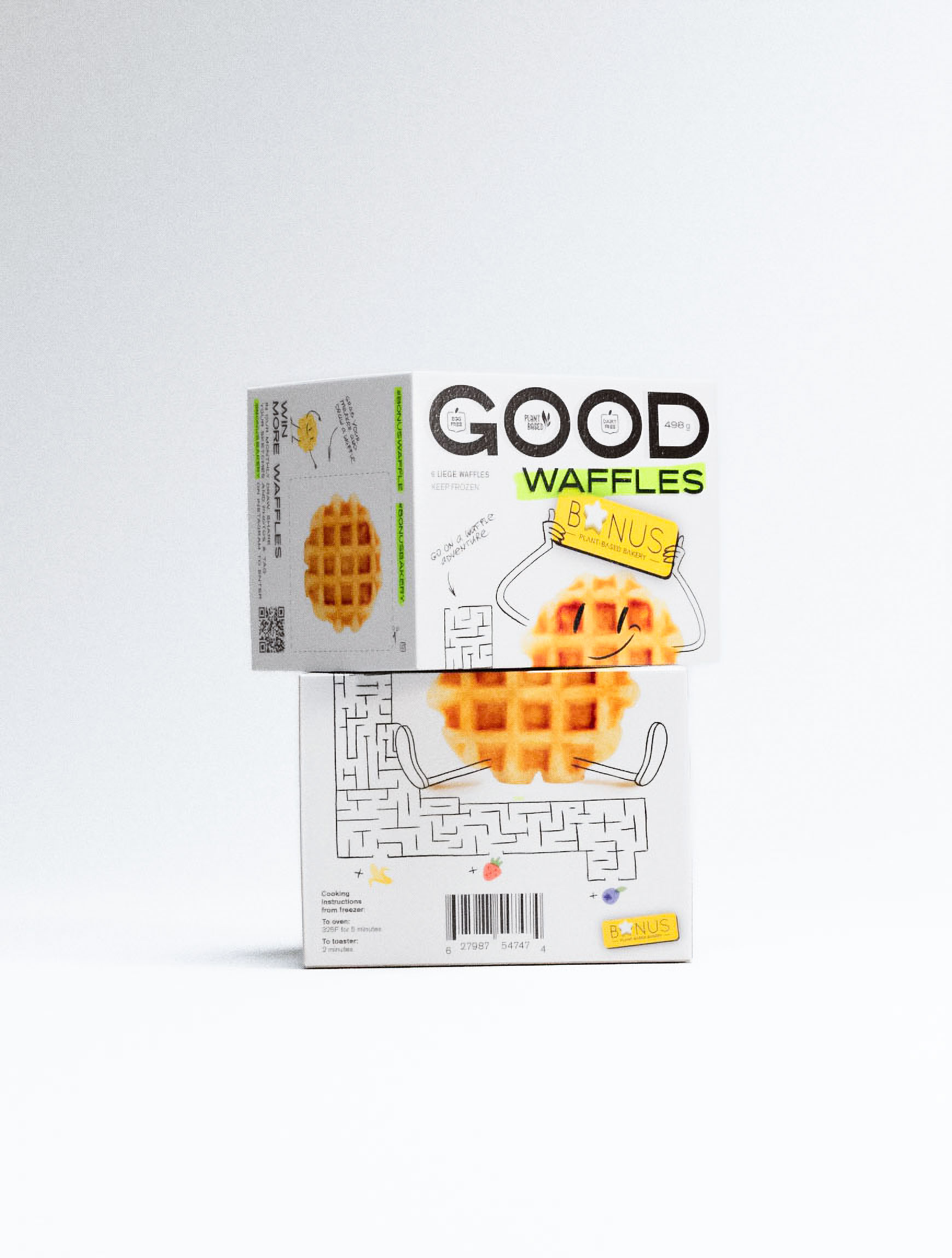 Strategic product photography showcasing Good Waffles frozen breakfast packaging against vibrant blue branded backdrop. Design agency photography demonstrates effective brand environment creation through repetitive logo pattern integration and color psychology implementation. White package design features clean minimalist typography hierarchy, appetizing food photography, and playful maze illustration elements that reinforce brand personality. Professional packaging design studio work evident in balanced information architecture, strategic product positioning, and consumer-focused visual communication. Bonus plant-based bakery messaging and barcode placement showcase comprehensive retail packaging considerations. Photography setup exemplifies branded content creation for social media marketing, e-commerce platforms, and design portfolio presentation perfect for breakfast food category positioning and millennial consumer targeting.